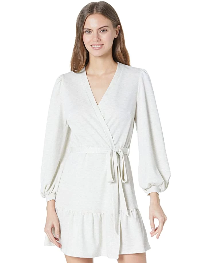 - Lounge in style and comfort, with the Eberjey® Naya – The Mademoiselle Kimono Robe. This robe features a low v-cut neckline, tie-knot waist belt closure, bishop sleeves, and ruffled hemline.