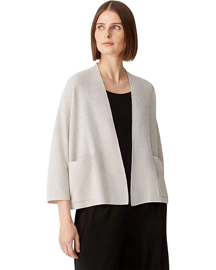 - The EILEEN FISHER® Cardigan with 3/4 Sleeves in Organic Linen Cotton Twist is the perfect layer to any chilly weather day in a boxy fit with two front patch pockets.
