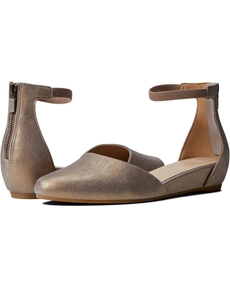Though the fit and size are good, the ankle strap is tight. The strap isn’t adjustable and doesn’t have much give. If you have very thin ankles this isn’t a problem. My ankles are not thick. They do have the look and low heel height that I was look for. The Platinum color is distressed metalic gold. I am not sure if sizing up half a size will make the strap larger. I got size 7.5 and the ankle strap measures 8.5 inches (the inner circumference).