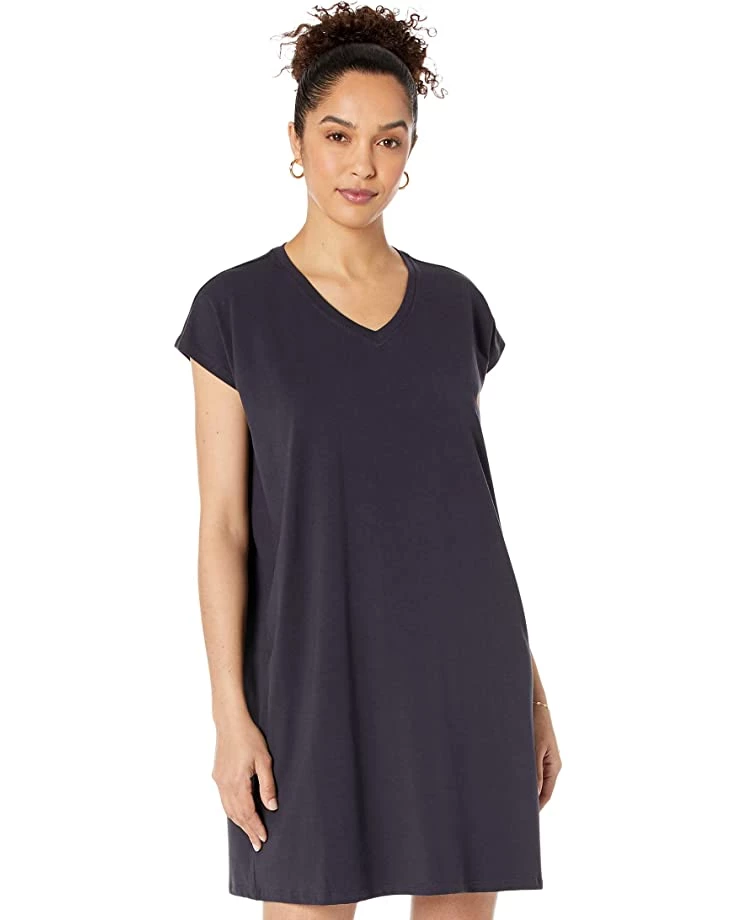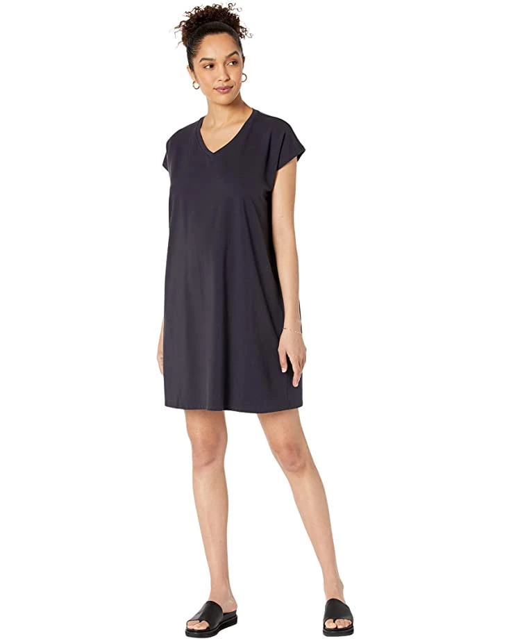 - Keep your outfit low-key and casual with the Eileen Fisher® V-Neck Boxy Knee Length Dress in Organic Pima Cotton Stretch Jersey.