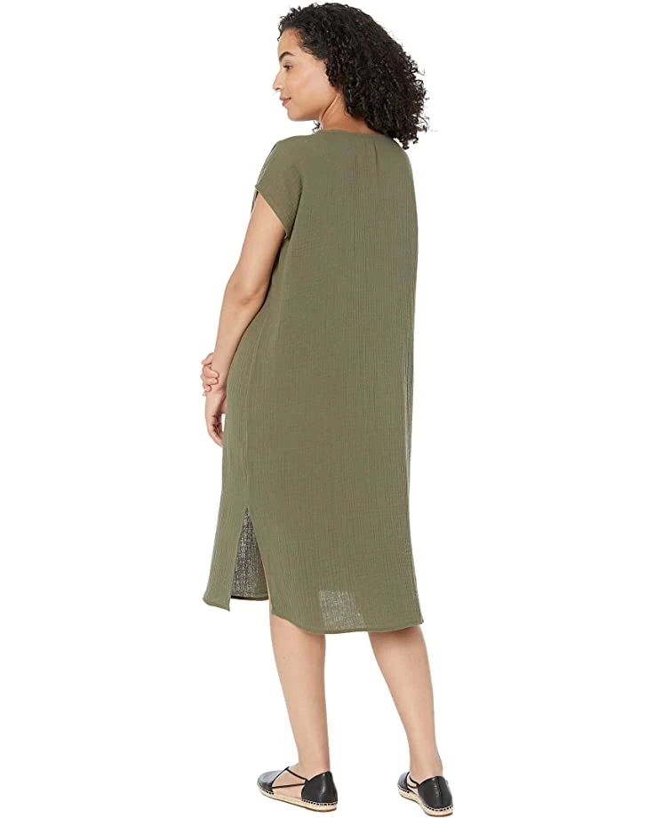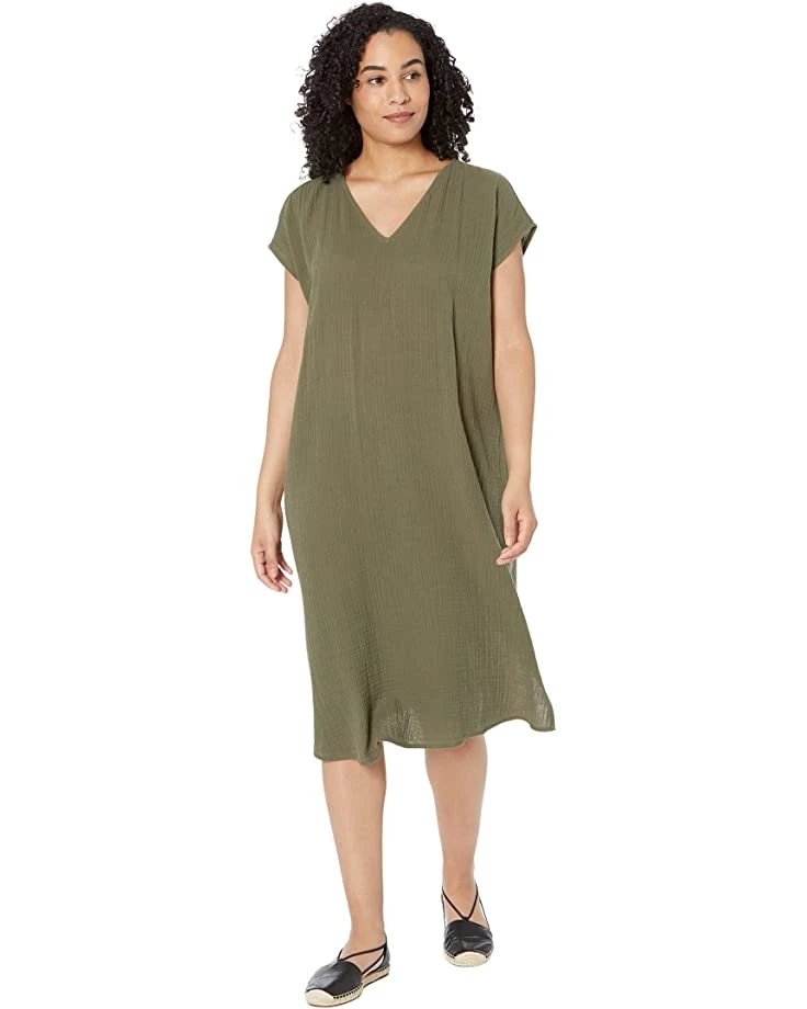 - Featuring a minimalistic design, the EILEEN FISHER® V-Neck Knee Length Dress looks chic and is perfect for a fun-filled outing.