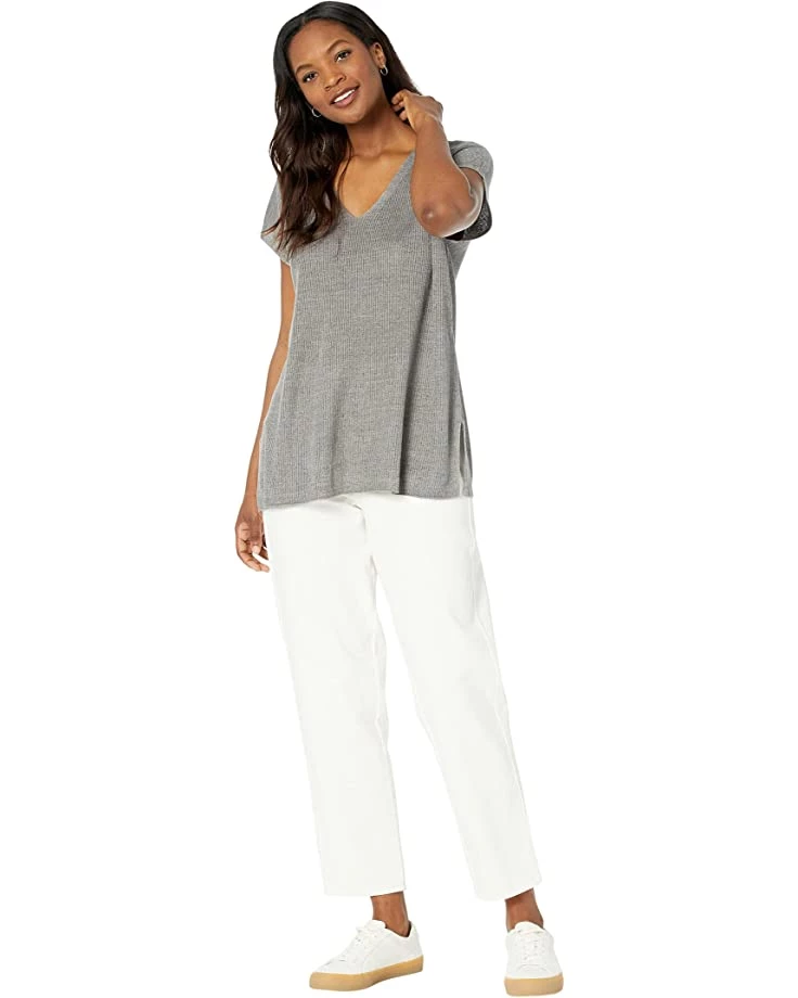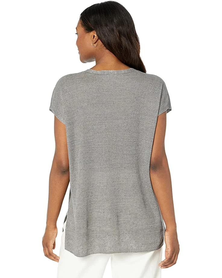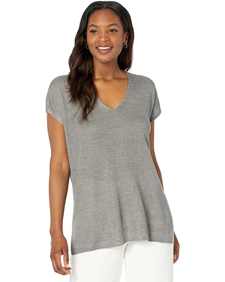- Get that airy feeling and stylish layers by wearing Eileen Fisher® V-Neck Sleeveless Pullover in Organic Linen Delave Rib.